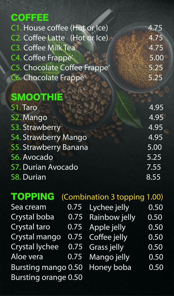 Tea and coffee mix. Toppings not included.Recommended: Coffee Jelly, honey boba, coffee jello.